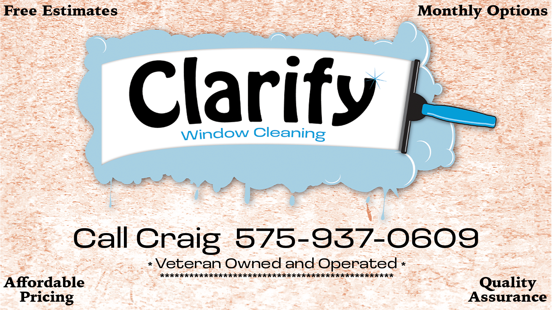 Senior Discounts, White Glove Treatment, Solar Panels, Free Estimates, Speedy Service. Serving Las Cruces, Alamogordo Cloudcroft, and HIgh Rolls, Clarify Window Cleaning will assess your window washing needs and complete each window cleaning with care. No Fuss No Muss, Squeeky Clean Windows. Your Home Looks Great with Shiney Clean Windows by Clarify Window Cleaning. Contact us at LasCrucesWindowWash@bizscoremail.com or call for an appointment today. (575) 937-0609 Your windows will thank you.